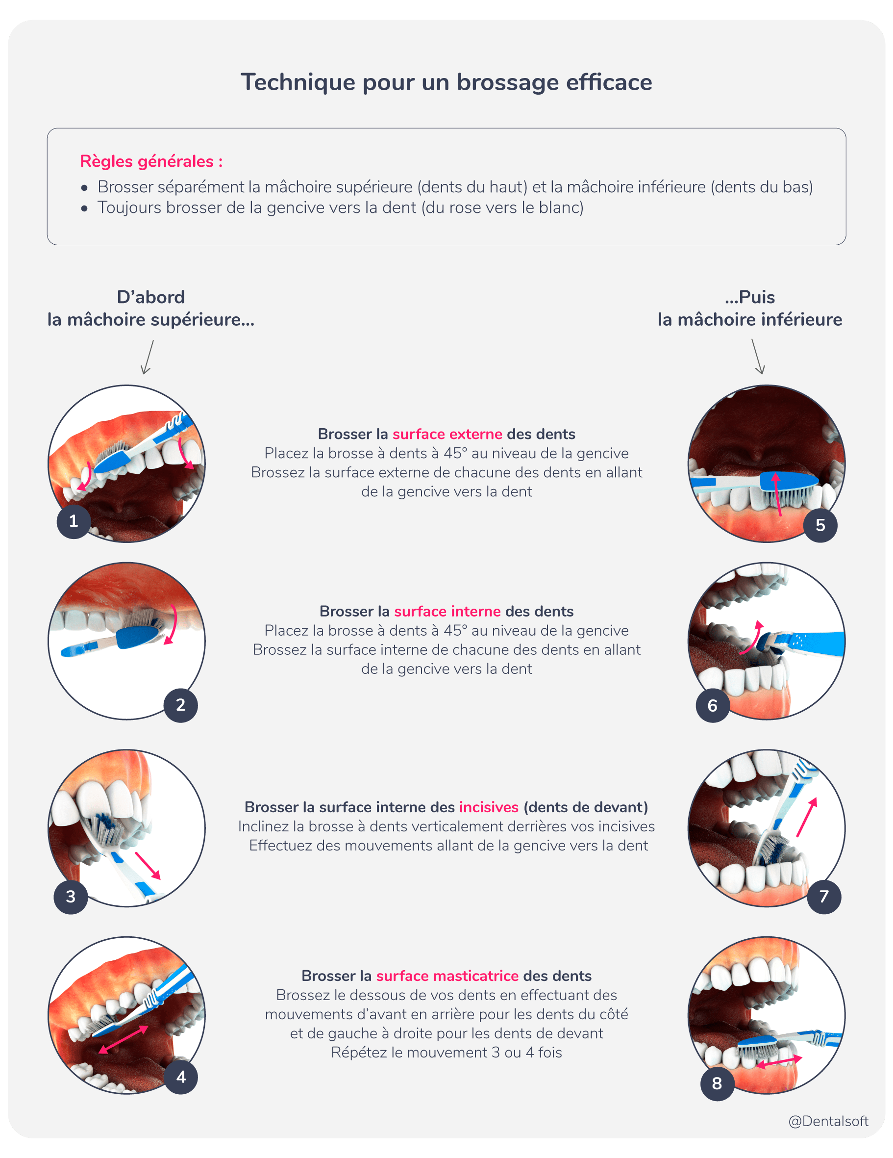 L’Union Française pour la Santé Bucco-Dentaire (UFSBD) recommande 2 brossages quotidiens (matin et soir) d’une durée de 2 minutes chacun, à l’aide d’une brosse à dents manuelle souple ou une brosse à dent électrique rechargeable. Nous conseillons un brossage après chaque repas pour tous les porteurs de dispositifs d’orthodontie.